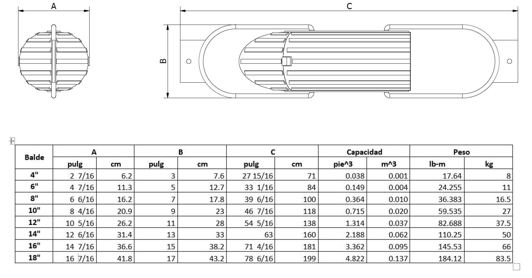 - Balde de acero 4″ , 6″, 8″, 10″, 12″, 14″, 16″ y 18 “.